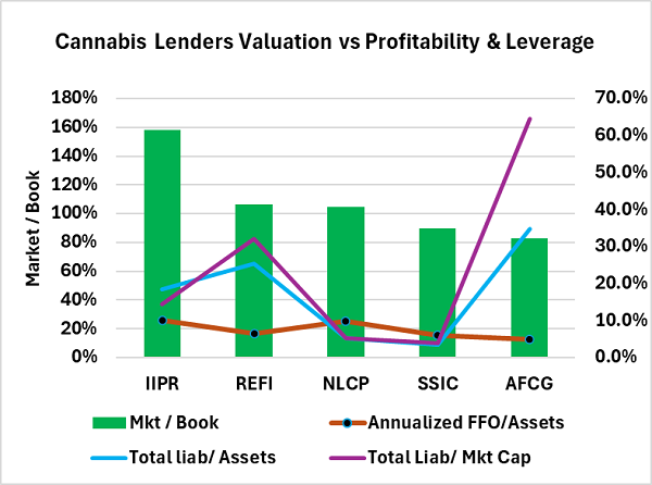 JUNE 21 2024 – We looked at the five largest cannabis lenders/sales-leaseback providers to try to ascertain whether they are fairly valued or not. Astute readers will point out that lenders like Chicago Atlantic, AFC Gamma, and Silver Spike are in a different business than sales leaseback providers such as IIPR and NewLake Capital. The lenders have collateralized loans, whereas the SL companies actually own the underlying real estate. Nonetheless, we view the two businesses as more similar than different: both accept credit risk from cannabis SSOs and MSOs in return for a spread on their cost of capital.