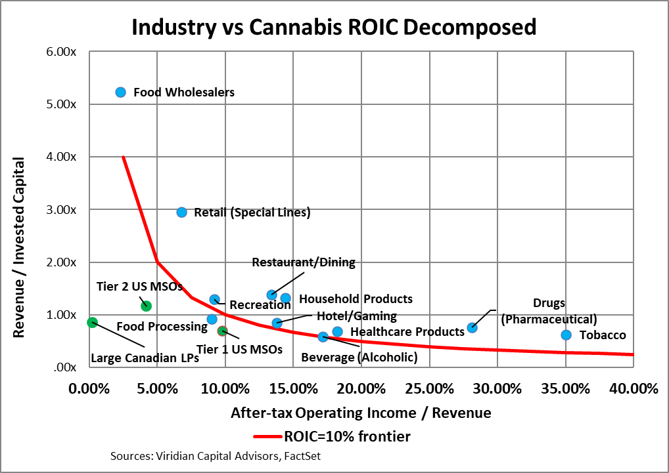 The graph above examines the components of ROIC for cannabis relative to other industries that are frequently compared to cannabis or considered potential acquirers of cannabis companies. All non-cannabis industries are displayed with blue circles, while three sectors of cannabis (Large Canadian LPs, Tier 1 US MSOs, and Tier 2 US MSOs) are shown by green circles. The red line shows the hypothetical combinations of factors that would create an ROIC of 10%—moving in the direction of up or to the right increases ROIC. Of the fourteen industry sectors (including cannabis) on the graph, 10 of them are above the 10% ROIC line. The three cannabis sectors have the lowest ROICs on the chart, both due to low profitability and low capital productivity.