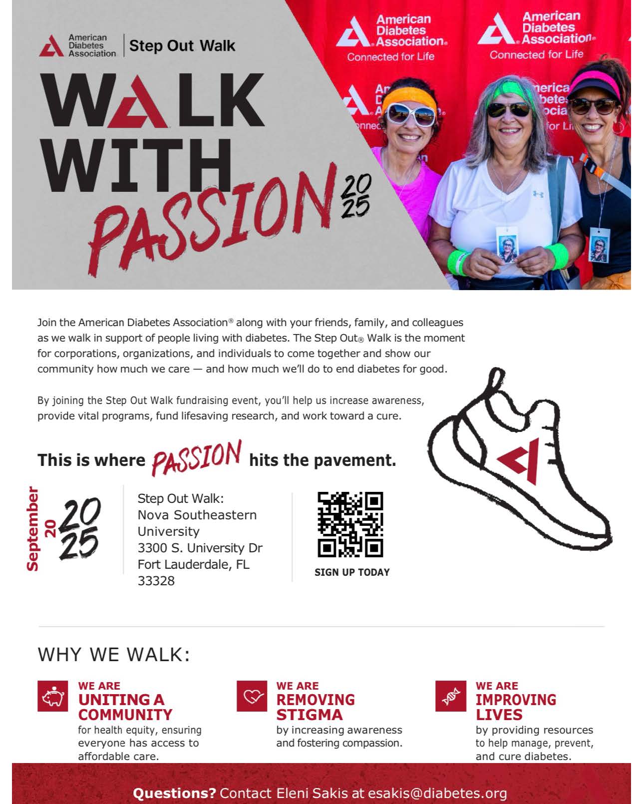 The American Diabetes Association’s Step Out Walk unites our community to advance research, advocacy, and programs for the 1 in 3 Americans living with diabetes or prediabetes. Join us by creating a team, registering to walk, or sponsoring to amplify impact and visibility within South Florida’s healthcare community. Learn more and register here: [insert registration link]. For sponsorship inquiries, contact Eleni Sakis at esakis@diabetes.org or (813) 540-0957. |