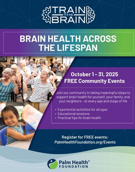 Spetember 2025 – Palm Health Foundation’s ninth annual Train the Brain community health campaign during October 2025, will focus on “Brain Health Across the Lifespan.” The month-long event series will spotlight opportunities for community members to access practical, science-backed information, and take meaningful steps to support brain health for themselves, their families, and their neighbors—at every age and stage of life.