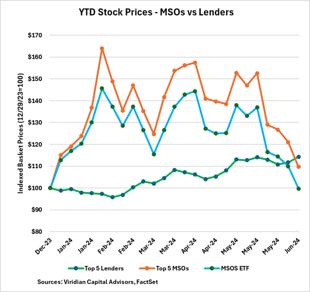 June 17, 2024 – This week’s Viridian Chart of the Week shows the YTD stock performance of two equally weighted baskets of stocks. The orange line depicts the YTD performance of a basket of the top five MSOs by market cap: Curaleaf, GTI, Trulieve, Verano, and Cresco. The green line shows the YTD results of a basket of the top five cannabis lenders and sale-leaseback providers: IIPR, Chicago Atlantic, AFC Gamma, NewLake Capital, and Silver Spike.