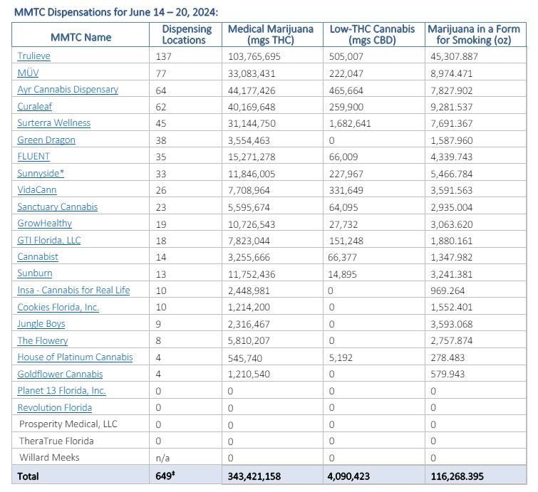 Qualified Ordering Physicians: 2,286 New Doctors added Last Week: -11 Reporting Period: June 14 - June 20, 2024 Amount of Medical Marijuana Dispensed - (mgs THC) 343,421,158