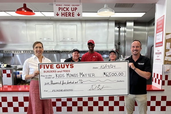 FORT MYERS, Fla. – October 24, 2024 – In recognition of September’s Suicide Prevention week, Five Guys Gives Back raised $6,500 for Kids’ Minds Matter to support educational programs, community outreach and more.