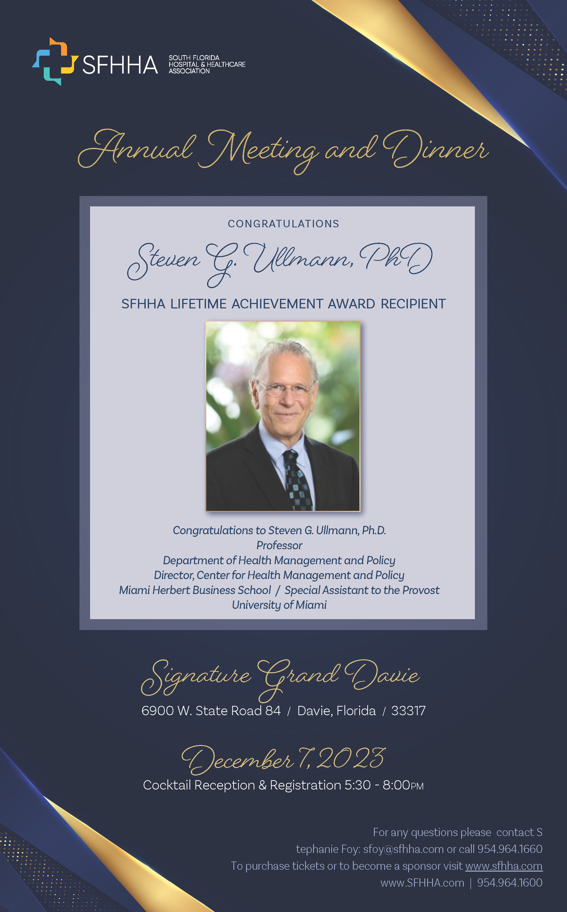 You've been invited! Join us on December 7, 2023, at the Signature Grand to congratulate/recognize the achievements of Mr. Steven G. Ullman, Ph.D., our 2023 Lifetime Achievement Award Recipient. Register now to secure your attendance, and check out our sponsorship opportunities! FOR MORE INFORMATION AND SPONSORSHIP CLICK HERE |