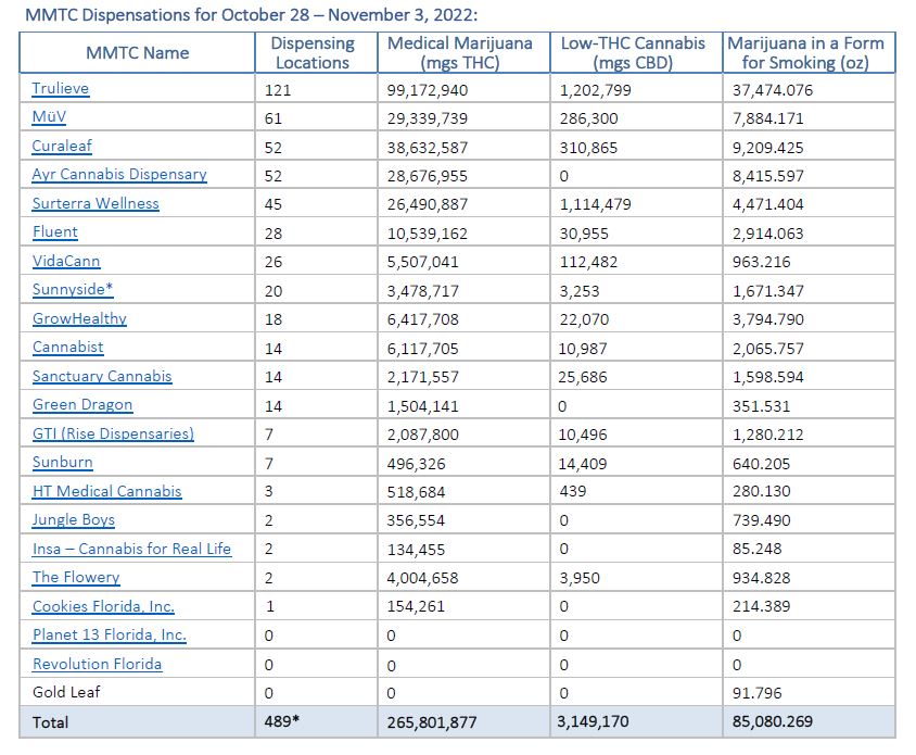Amount of Low-THC Cannabis Dispensed - (mgs CBD ) 3,149,170 Amount of Marijuana in a Form for Smoking (oz) 85,080.269 Approved Dispensing Locations: 489 Added Last Week: +1