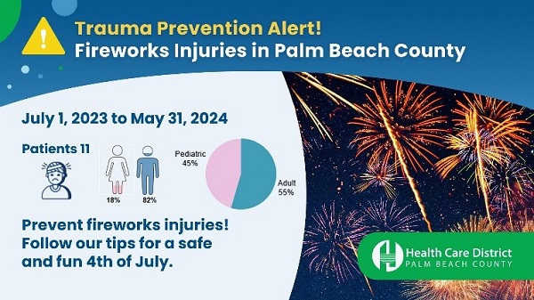 July 1. 2024- As we approach the July Fourth holiday, the Health Care District of Palm Beach County’s Trauma Agency is sharing data on traumatic injuries caused by fireworks and offering tips to prevent these injuries. Over the past year (June 2023 – May 2024), 11 Palm Beach County residents or visitors were treated for traumatic injuries related to fireworks, including five children aged 12-17. Approximately 60 percent of these critical injuries occurred during last year’s July Fourth festivities. About 40 percent occurred during New Year’s Eve.