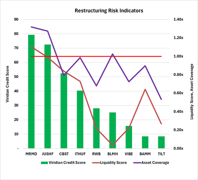 Despite hitting our screen, we believe the two companies on the far left, MariMed and Jushi, are unlikely restructuring candidates. MariMed is ranked #13/25 in our weekly credit ranking, and Jushi ranks 15/25. Both have 1x liquidity or better, and both have over 1.2x asset coverage (derived from our option-based methodology). Of the two, Jushi carries a bit more risk in our opinion due to the $139M of 2026 debt maturities noted in its June 10Q, and the fact that the second priority notes are offered at yields above 20% according to Ventum Capital. Still, we believe the company will be able to roll its debt.