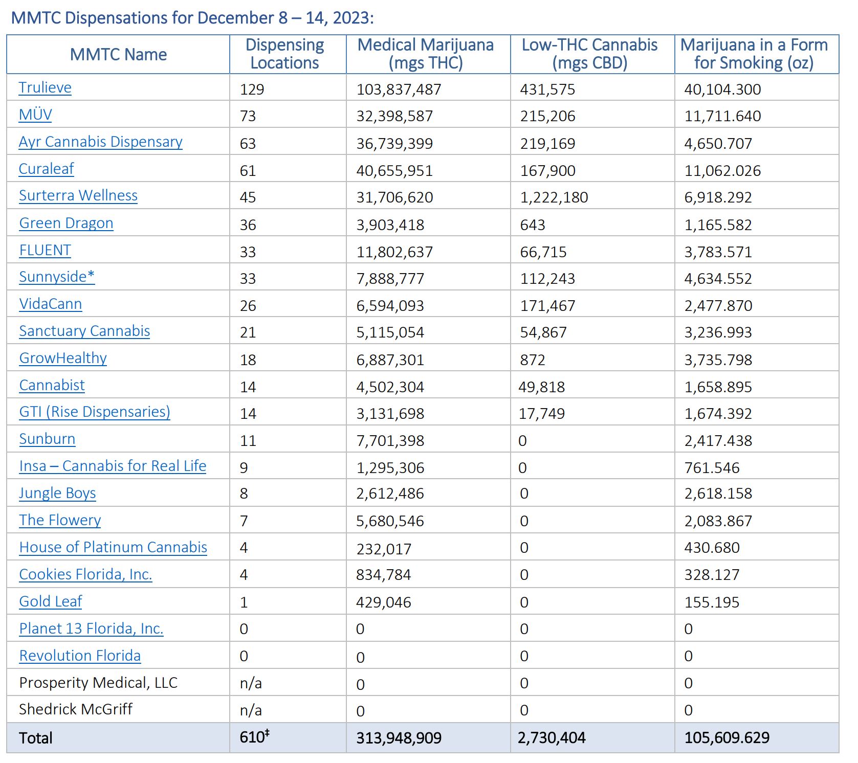 New Doctors Last Week: +5 Reporting Period: DEC 8 TO DEC 14 2023 Amount of Medical Marijuana Dispensed - (mgs THC) 313,948,909