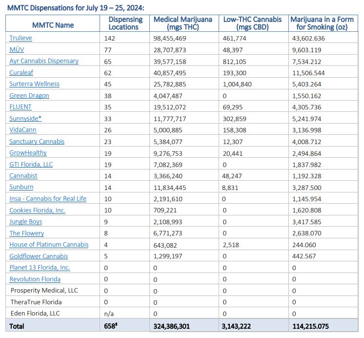-Amount of Marijuana in a Form for Smoking (oz) 114,215.075 Approved Dispensing Locations: 658 Added Last Week: 1 TRULIEVE - OCALA |