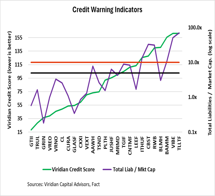 More serious issues are often signaled when companies pierce the 10x level. These companies included Cannabist (32.96x), Red White & Bloom (31.34x), Body & Mind (10.69x), Vibe (51.28x), and Tilt Holdings (69.82x). For most of these companies, the equity value damage has already been done, but investors exposed to the credit via debt positions or receivables need to Investors need not be surprised by credit issues. Monitoring the Viridian Credit ranking and total liabilities-to-market cap will often provide critical early warning signals. |