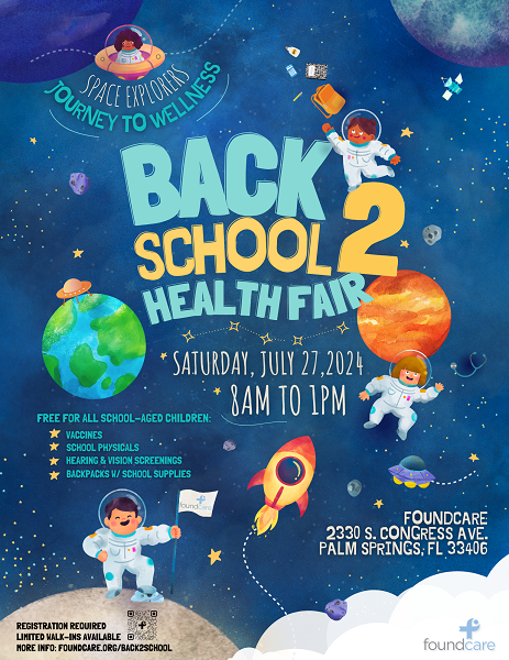 WEST PALM BEACH, Fla. June 25, 2024 – – FoundCare is on a mission to ensure every student starts the new school year with a clean bill of health. On Saturday, July 27, FoundCare will host its annual free Back-to-School Health Fair at 2330 S. Congress Ave., Palm Springs. The event will run from 8 a.m. to 1 p.m., offering school-aged children complimentary hearing and vision screenings, school physicals, vaccinations, and backpacks filled with school supplies.