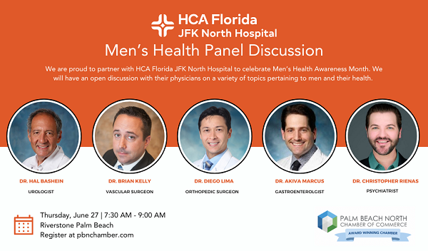 June 27, 2024 – HCA Florida JFK North Hospital is proud to celebrate Men’s Health Awareness Month with a Men’s Health Panel Discussion. In partnership with the Palm Beach North Chamber of Commerce, we invite the community to join us for an open discussion featuring five esteemed physicians who will address a variety of topics pertaining to men’s health.