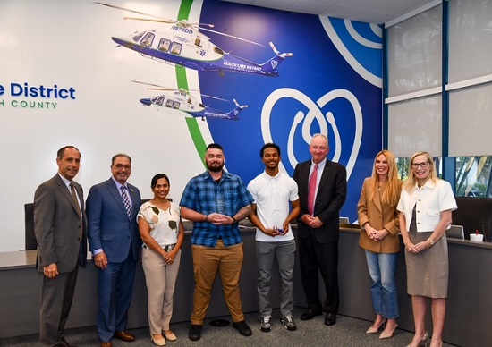 October 3, 2025 – West Palm Beach, FL – At its September 30th meeting, the Health Care District of Palm Beach County’s board of commissioners recognized two of our first responders on the District’s ground transportation team – paramedic Tony Camejo and EMT Tre’ Lawrence – who went above and beyond to protect and serve our communities. While returning from a transport in the rain the night of August 29, they noticed a woman walking alone along Southern Boulevard who appeared to be in distress. When they stopped to assist her, the team contacted the Palm Beach County Sheriff’s Office, which confirmed she had been reported missing. As a result of their public service, Tony and Tre helped reunite the woman with her grateful family.