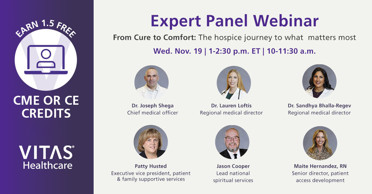 MIRAMAR, FL – In honor of National Care at Home Month, VITAS Healthcare, the nation’s leading provider of end-of-life care, invites healthcare professionals to a free, accredited webinar titled “From Cure to Comfort: The Hospice Journey to What Matters Most.” The virtual event will take place on Wednesday, November 19, 2025, from 1:00–2:30 p.m. ET / 10:00–11:30 a.m. PT. Early registration is encouraged as space is limited.