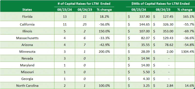 For this week, Florida takes the top spot among U.S. states, with an 18.2% increase in the number of capital raises for cannabis companies in the state, and a 165.1% increase in the dollar amount of these investments. Investors continue to bet on the passage of adult-use cannabis in November.