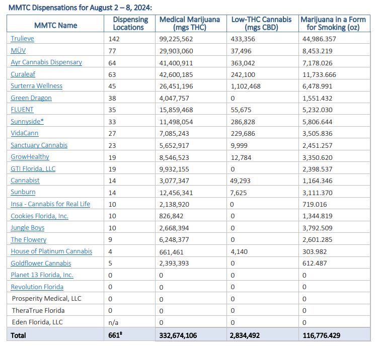 -Amount of Marijuana in a Form for Smoking (oz) 116,776.429 Approved Dispensing Locations: 661 Added Last Week: 3 Curaleaf - Pensacola