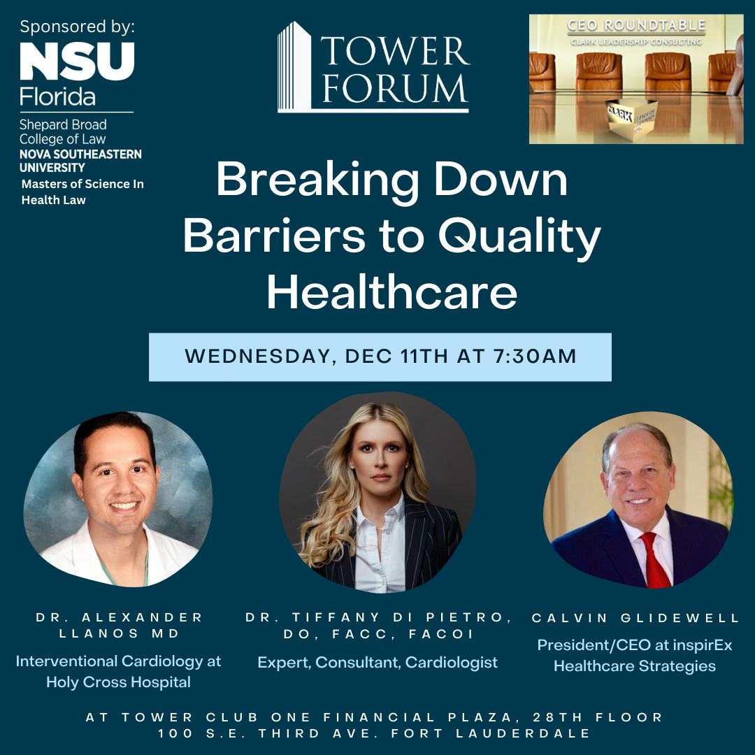 Calvin Glidewell, a seasoned healthcare administrator at Broward Health Hospitals and the panel's moderator, will offer valuable insights on effectively navigating the complexities of hospital operations. Alexander Llanos, a Harvard-trained cardiologist and clinical leader at Holy Cross, offers a unique dual perspective, bridging the gap between physicians and administrators. Tiffiany Di Pietro, an expert in internal medicine and general cardiology, provides valuable insights from the private practice perspective.
