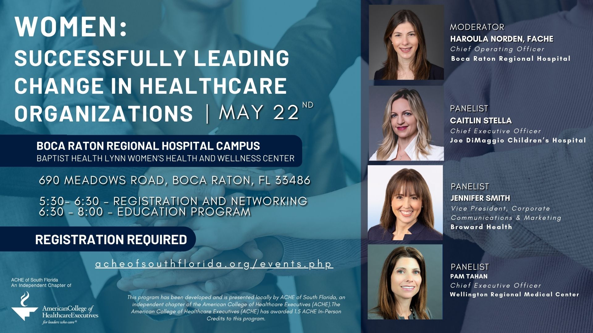 ACHE 0F SOUTH FLORIDA NETWORKING: MAY 29, 2025 PINSTRIPES AVENTURA EDUCATION: MAY 22, 2025 BOCA RATON REGIONAL HOSPITAL SOLD OUT LINK TO REGISTER |