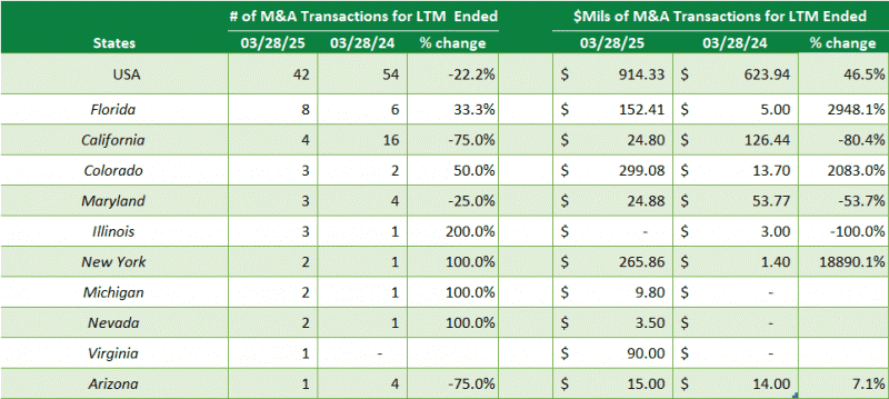 Florida ranks number one in M&A transactions by state with 8 deals completed for the LTM period ended 3/28/2025. Total deal consideration increased significantly to $152.4M from $5.0M.