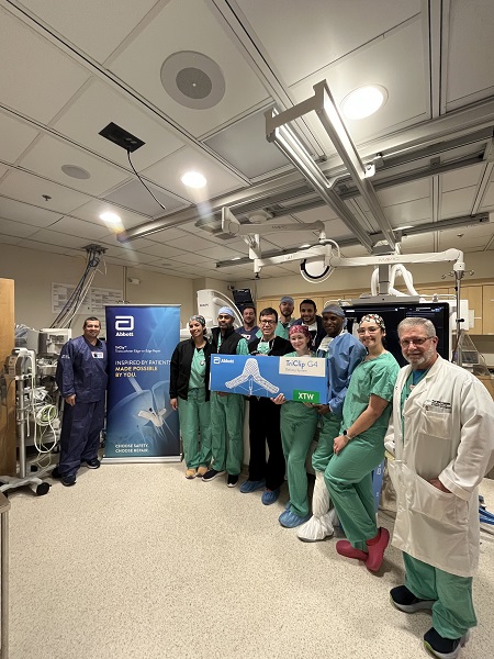 PALM BEACH GARDENS, FL- December 20, 2024 –Palm Beach Gardens Medical Center is the first hospital between Orlando and northern Palm Beach County to perform an Abbott TriClip™ transcatheter edge-to-edge repair (TEER). This is a minimally invasive therapy that treats patients with a leaky tricuspid valve, a condition known as tricuspid regurgitation (TR), without the need for open-heart surgery. TriClip is a first-of-its-kind therapy that repairs the tricuspid valve in patients and is backed by data demonstrating safety, effectiveness and quality-of-life benefits. The procedure was completed by structural cardiologist, Dr. Augusto Villa.