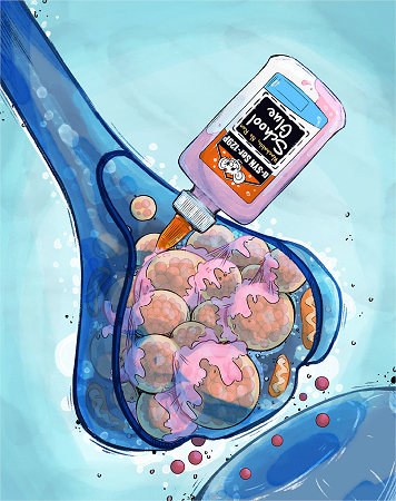 Artist’s rendering of a synapse showing phosphorylated α-synuclein in pink “gluing” synaptic vesicles together. Credit Roy Lab, UCSD