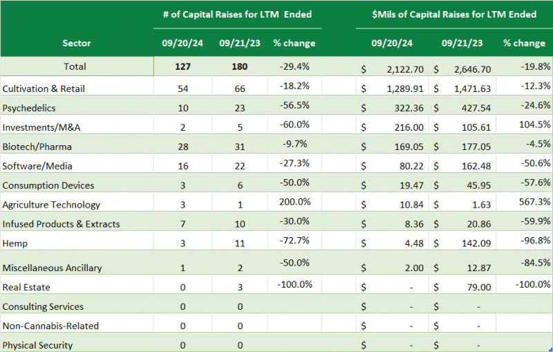 As more states seek to regulate or ban "intoxicating hemp" our data is showing the true impact on investor interest in the Hemp sector. For the LTM period ended 9.20.24 vs. the same period in 2023, capital raise activity for the Hemp sector is down 72.7% and the total dollars raised declined 96.8%. We've seen this trend for more than two months. View This Week's Viridian Sector Deal Tracker For a Deeper Dive Into M&A and Capital Raise Transactions by Industry Sector