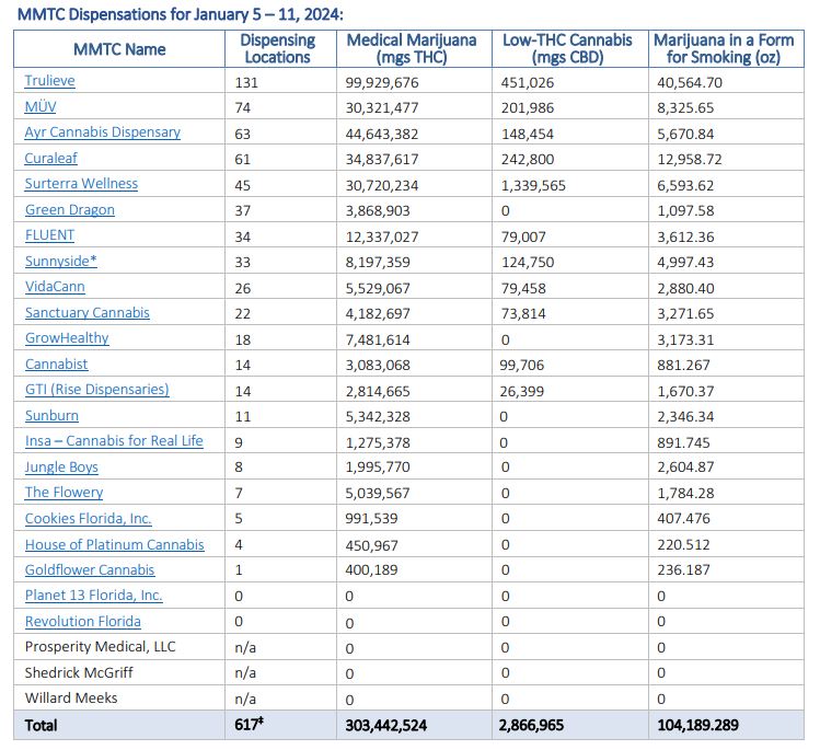 New Doctors Last Week: +20 Reporting Period: JAN 5 TO JAN 11 2024 Amount of Medical Marijuana Dispensed - (mgs THC) 303,442,524