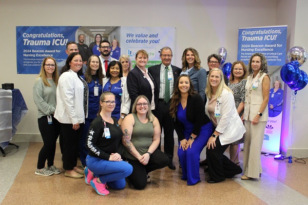 August 2, 2024 — Lee Health’s Trauma Intensive Care Unit (ICU) at Gulf Coast Medical Center is pleased to be awarded a national three-year honor by the American Association of Critical-Care Nurses (AACN). The Beacon Award for Excellence is a significant milestone on the path to exceptional patient care and healthy work environments. It recognizes unit caregivers who successfully improve patient outcomes and align practices with AACN’s six Healthy Work Environment Standards.
