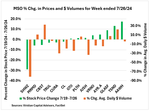 The Viridian Chart of the Week looks at the percentage changes in stock prices and average daily dollar volume for large MSOs from the week ended 7/19/24 to the week ended 7/26/24.