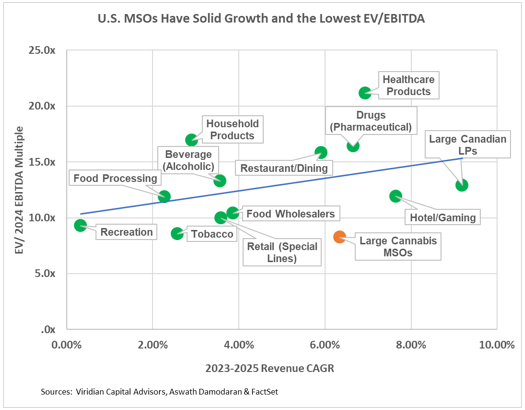 ARE CANNABIS STOCKS UNDERVALUED VS. ALCOHOL, TOBACCO, PHARMACEUTICAL, HEALTHCARE PRODUCTS AND FOOD STOCKS? April 22, 2024- The chart shows Enterprise Value to 2024 consensus EBITDA multiples on the vertical axis against 2023-2025 Revenue CAGR on the horizontal axis for thirteen different consumer products industries.